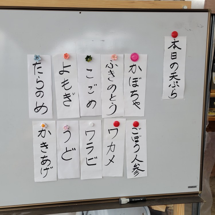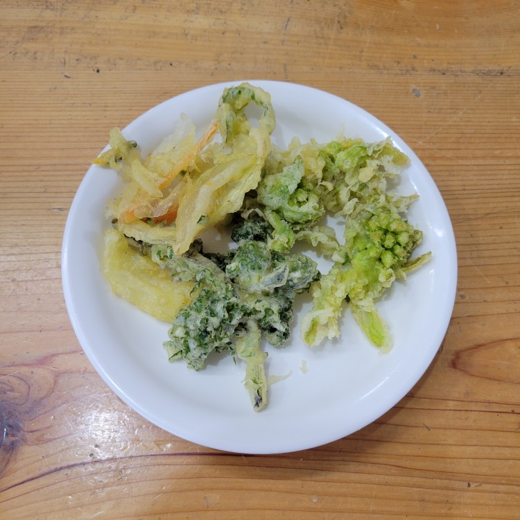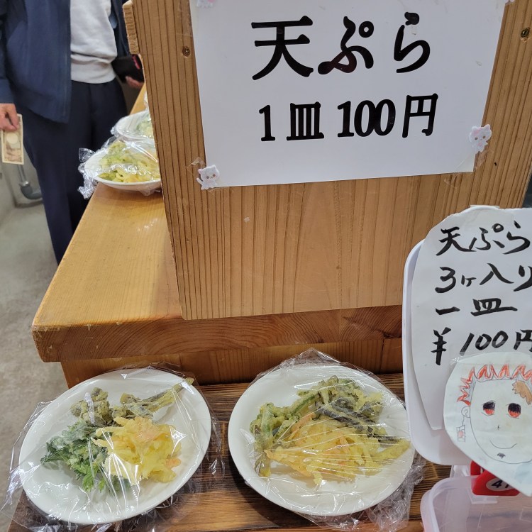 天ぷらは地元の旬の山菜・野菜を揚げた揚げたてです。今のところ一皿100円です。