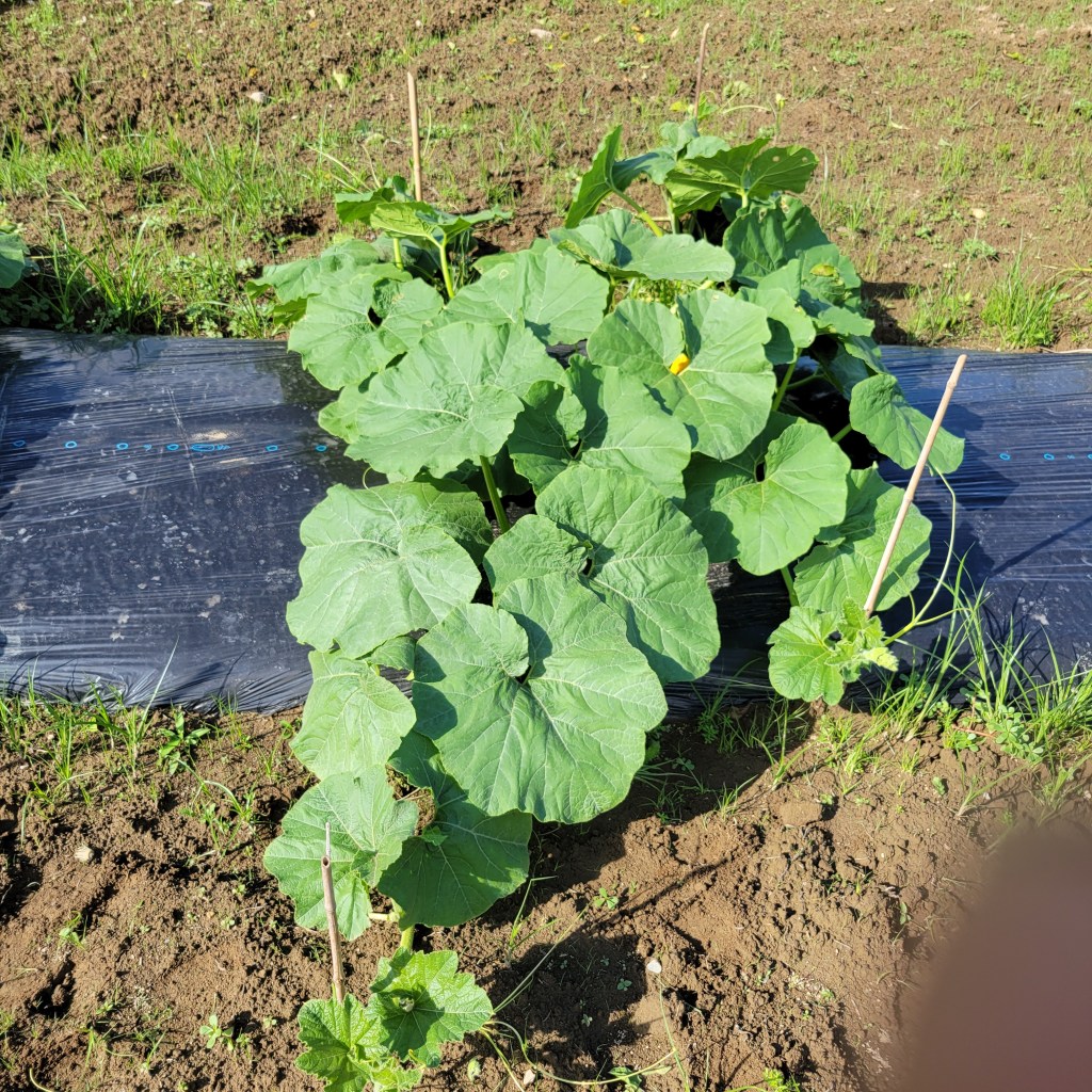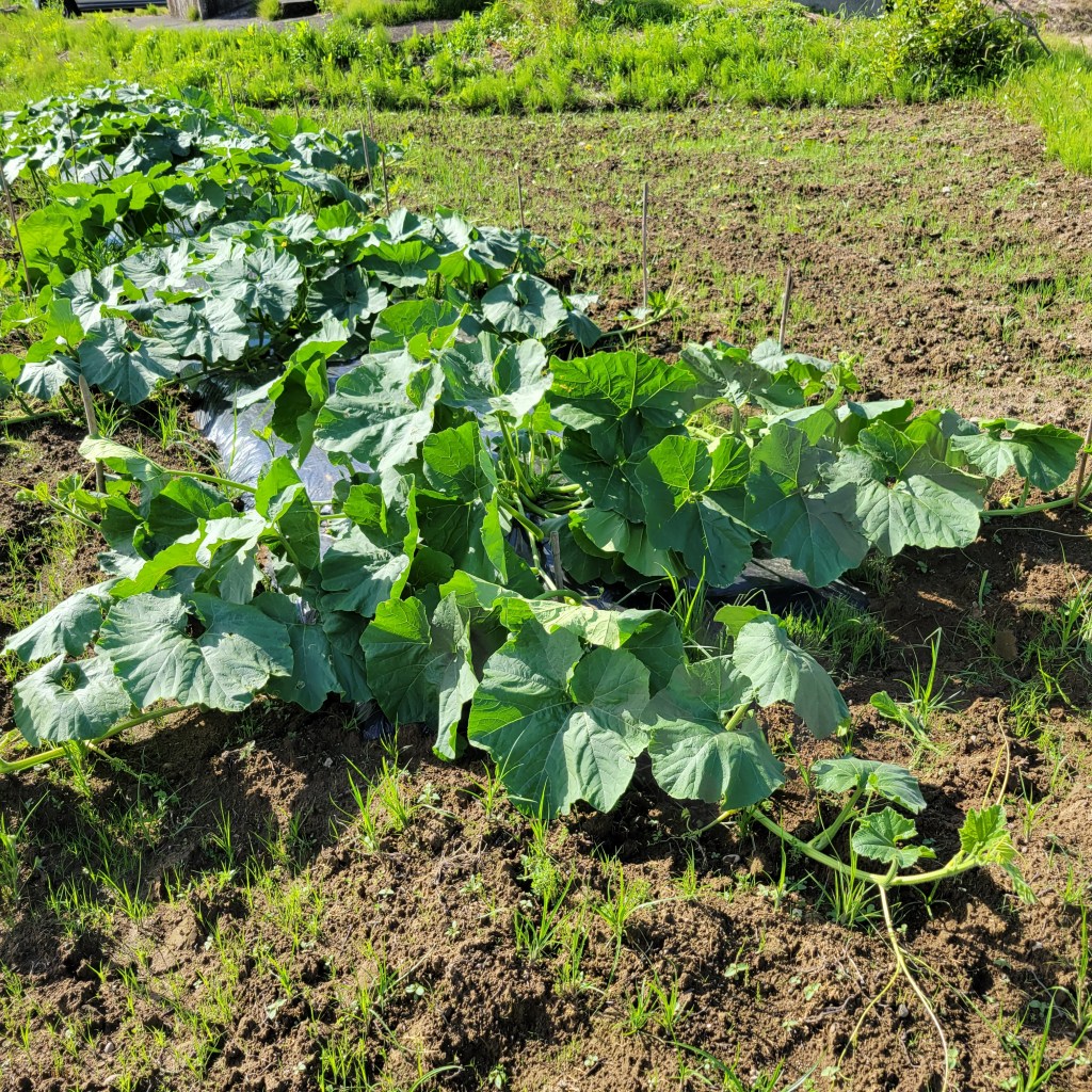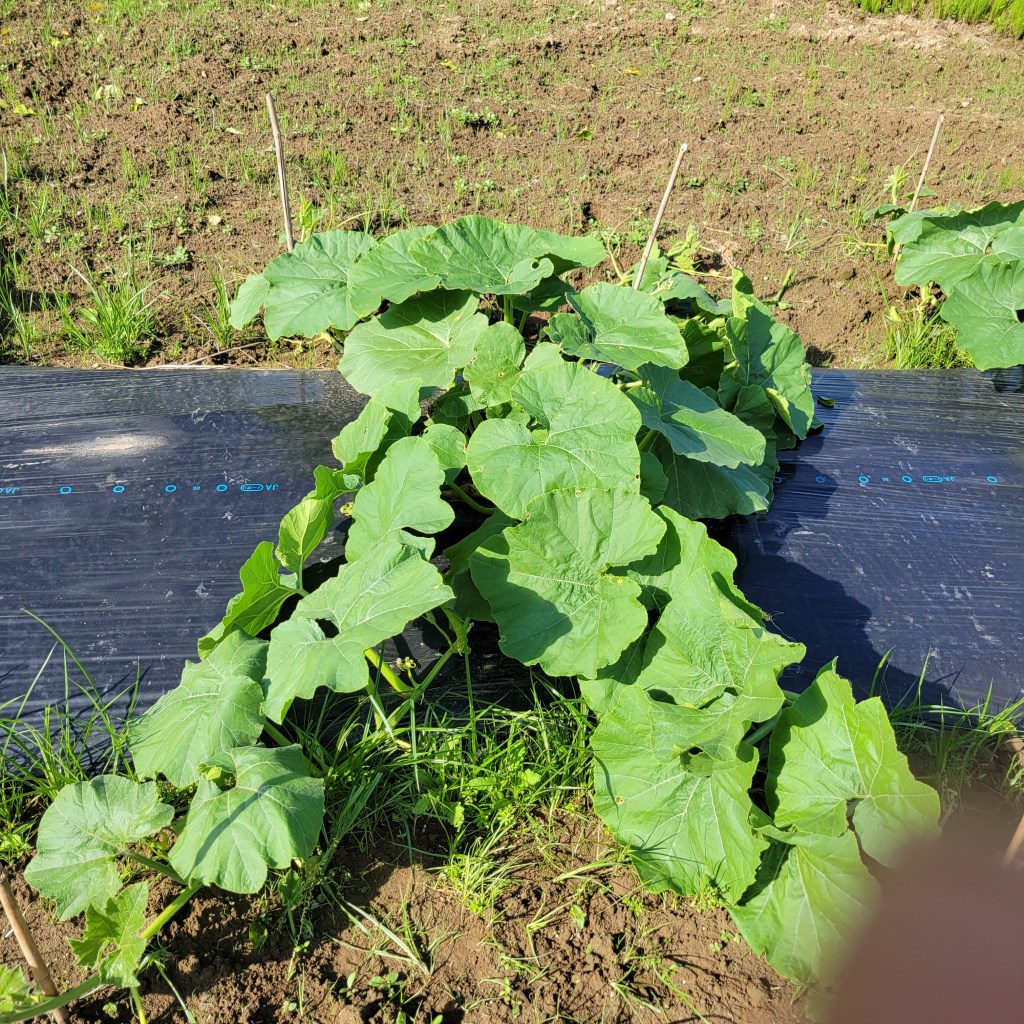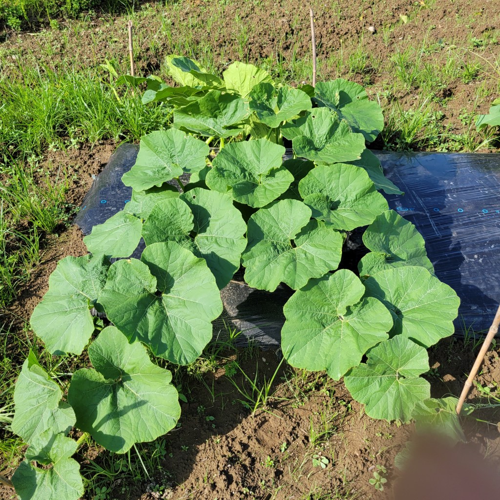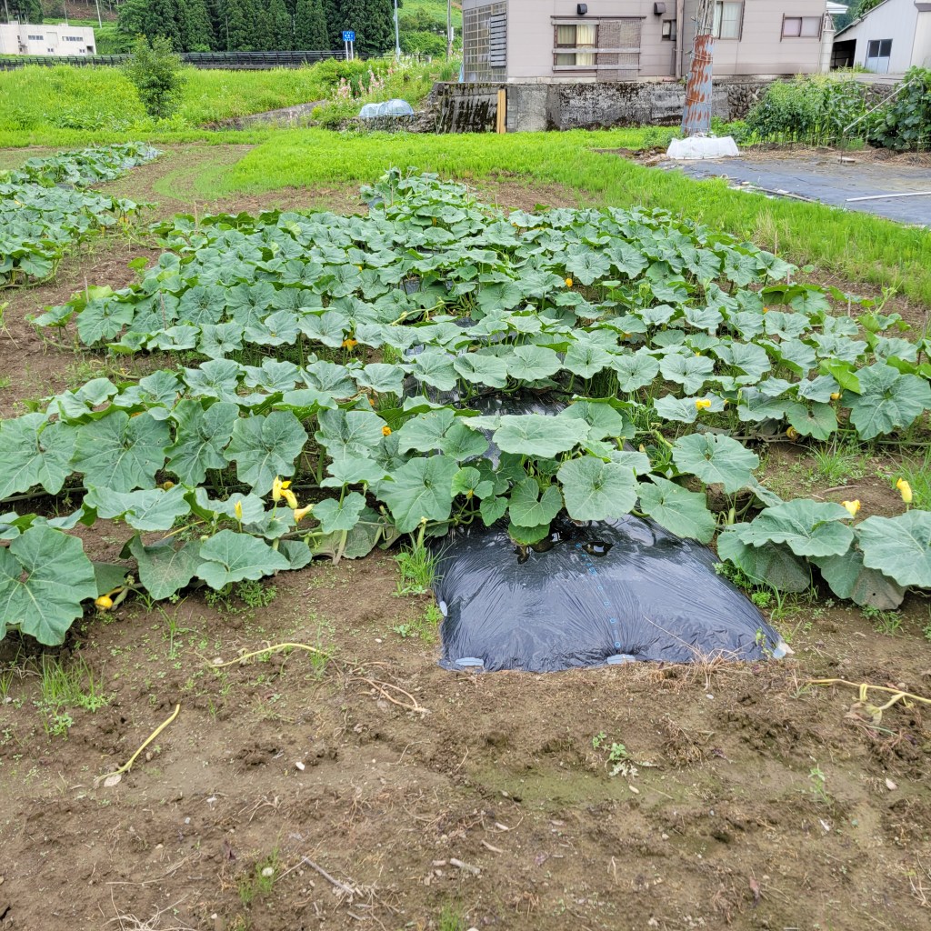 少し遅いのですが、化成肥料8-8-8をマルチの際から1.5メートル範囲に撒きました。一株片側で350缶一杯くらいのイメージです。(だいたい)。本来は蔓がマルチからはみ出してくる前にあげて、うなっておくのが望ましいのですが、もう蔓が伸びて無理なので撒いたあとは放置です。