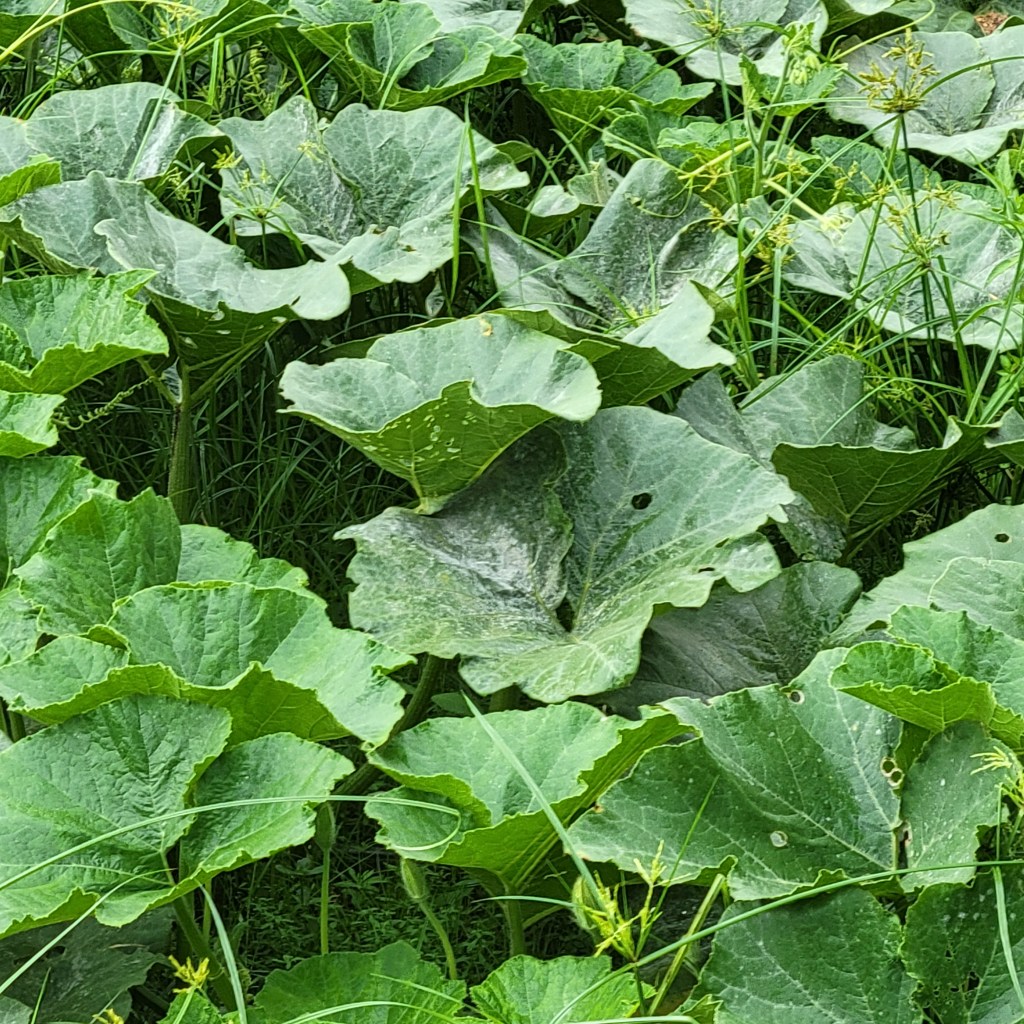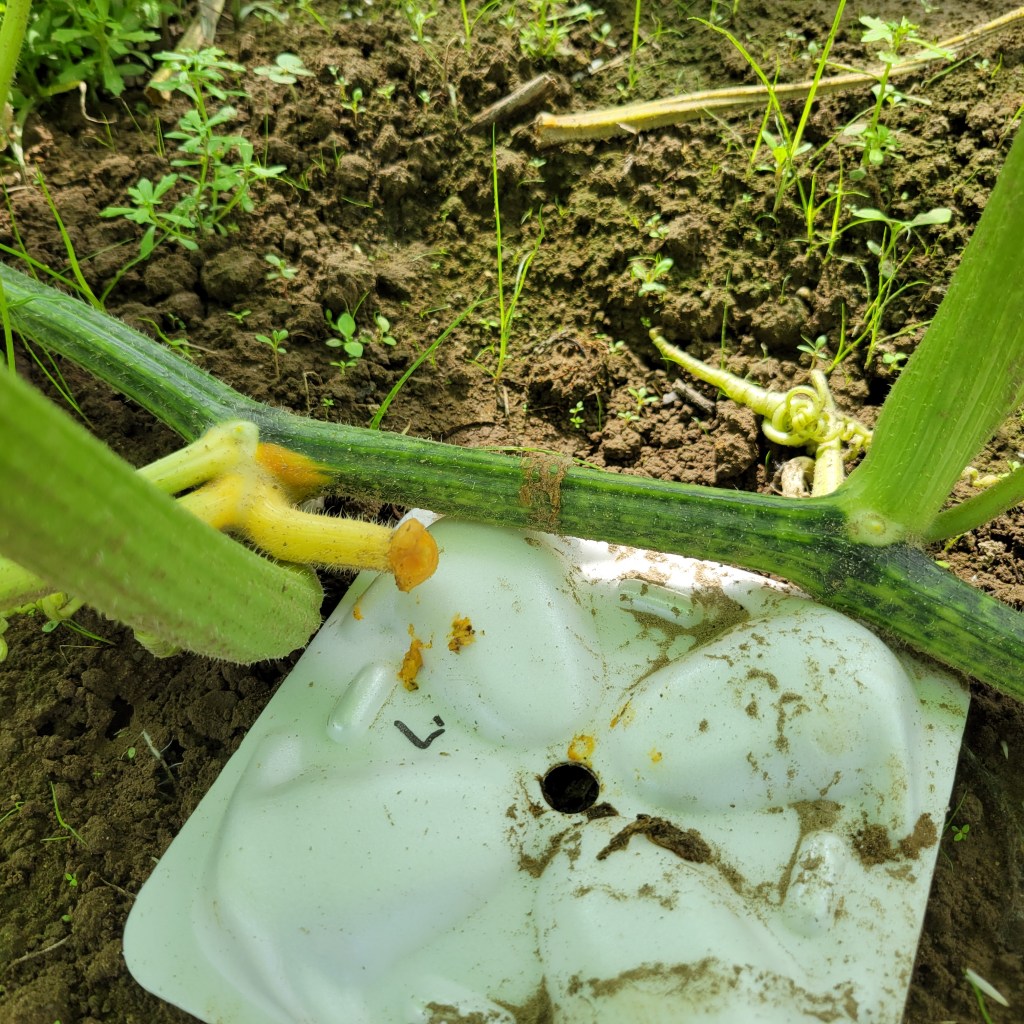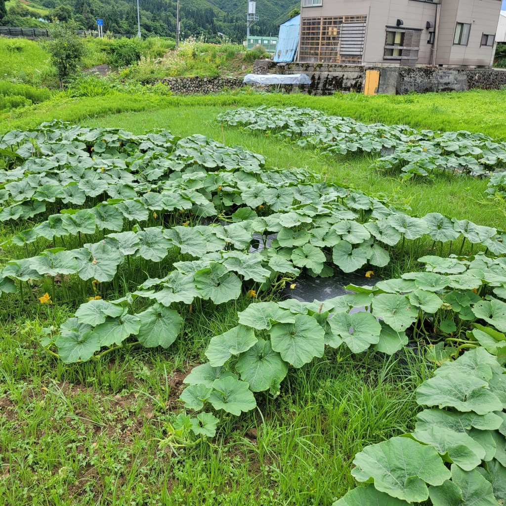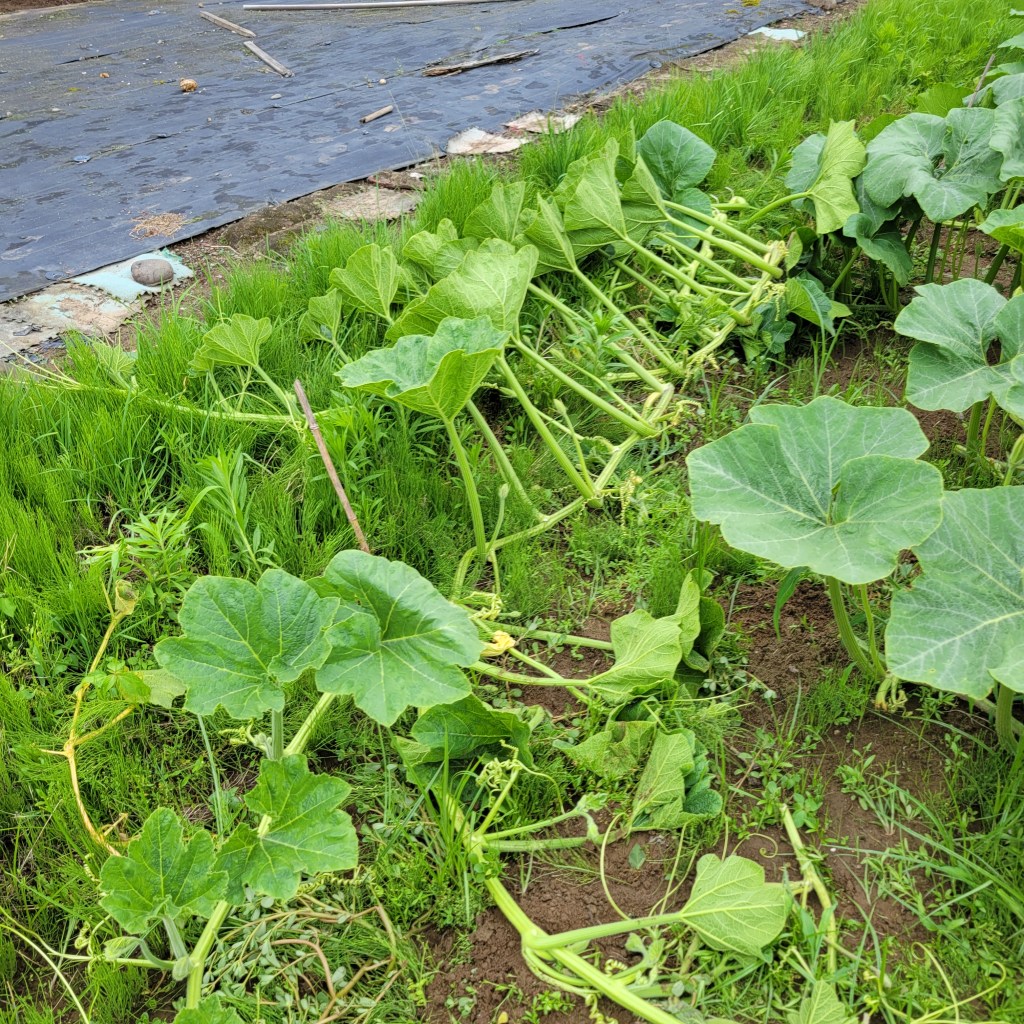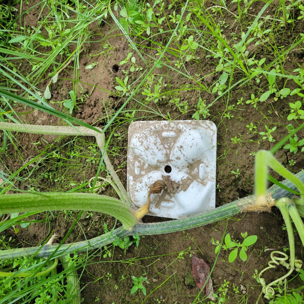 少し遅いのですが、化成肥料8-8-8をマルチの際から1.5メートル範囲に撒きました。一株片側で350缶一杯くらいのイメージです。(だいたい)。本来は蔓がマルチからはみ出してくる前にあげて、うなっておくのが望ましいのですが、もう蔓が伸びて無理なので撒いたあとは放置です。