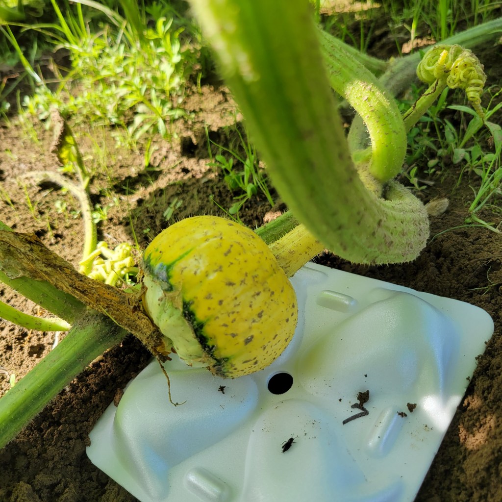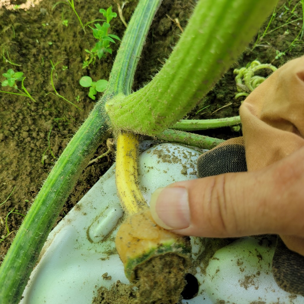 実に触れないためには子づるを持ち上げる必要があります。こづるの途中から出た根が地面をつかんでいますが、少し剥がしても構わないので、実に触れずに実の下を軽く整地してマットを敷きます。