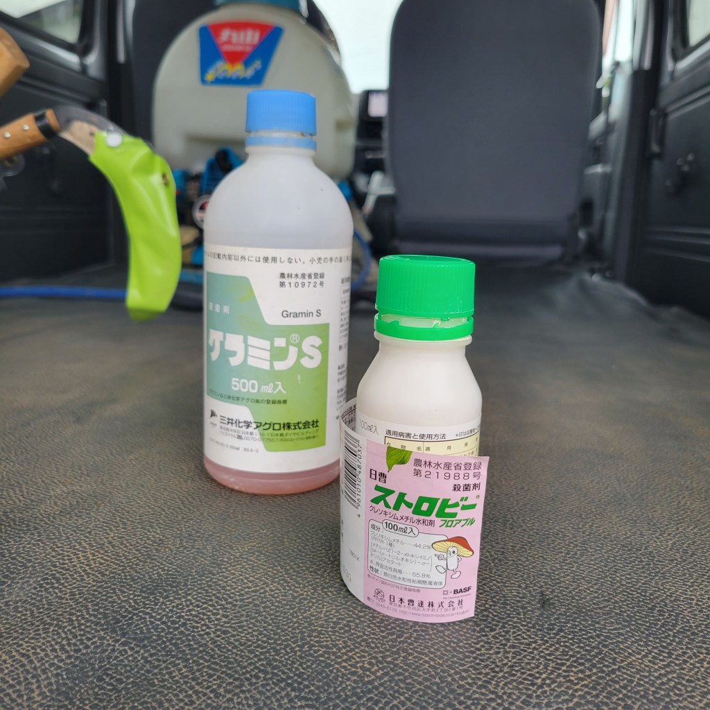 村長は時期的に放っておいてよいだろうと言いますが、文一さんも薬をかけたとのことなので人に聞きながらやりました。