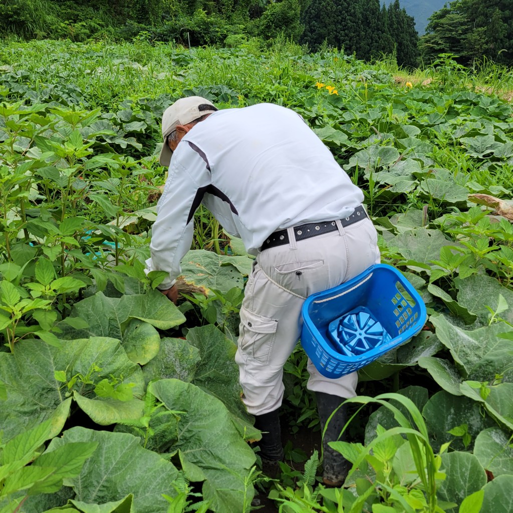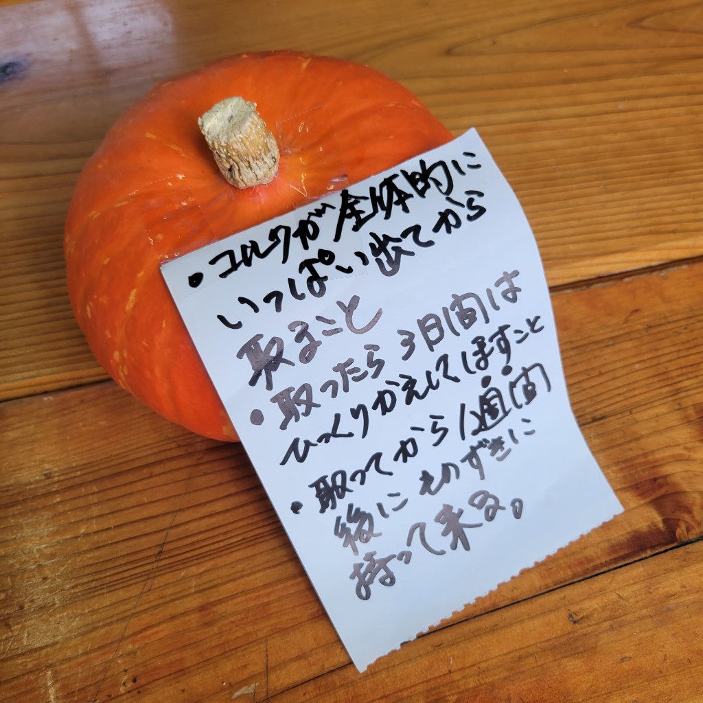 ヘタがコルク化してから収穫し、出荷前には裏返して三日間通気のよいところで干して保管、収穫から一週間後に出荷可能。食べ頃は10日後からです。