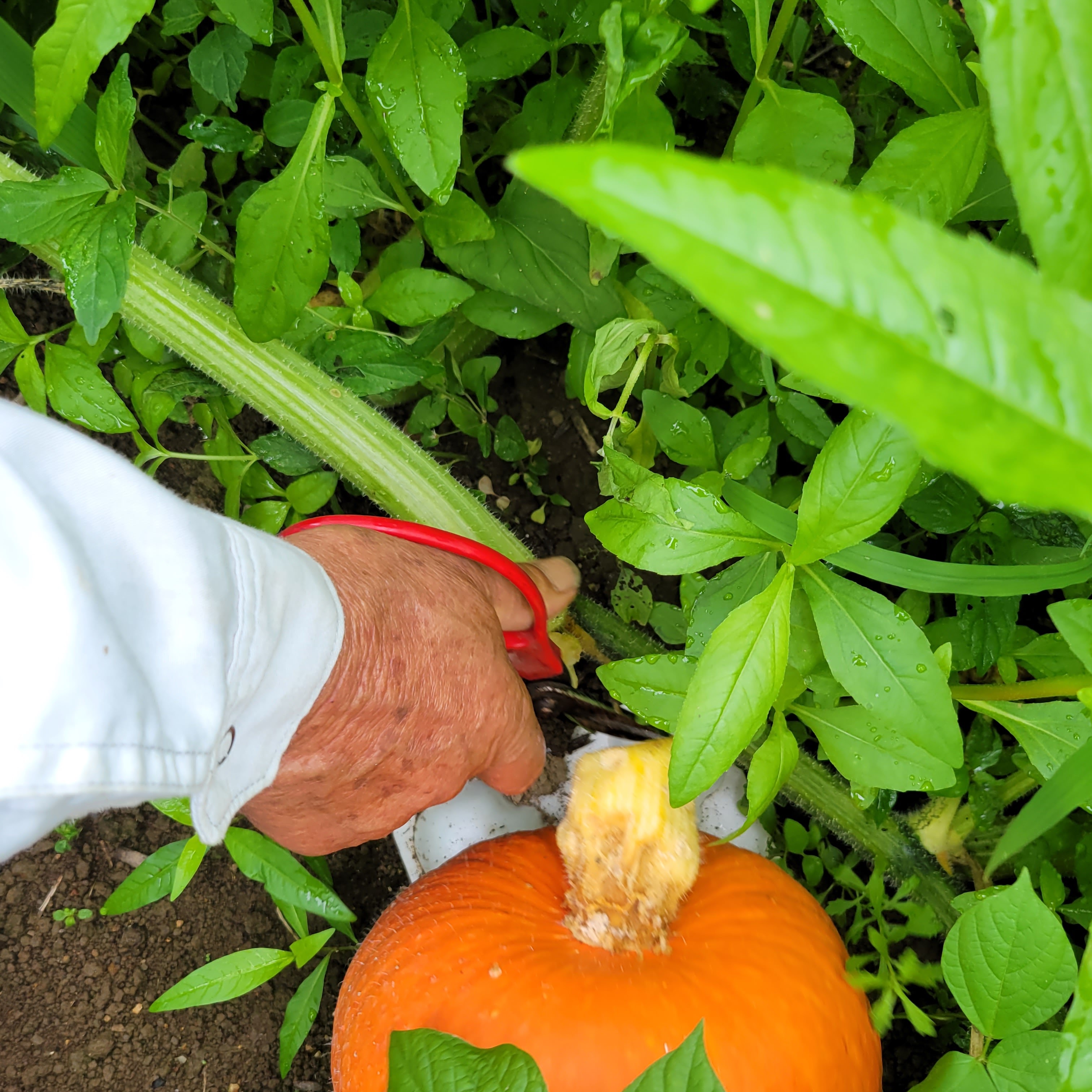 村長の畑で、最初に植えた株から収穫が始まりました。
