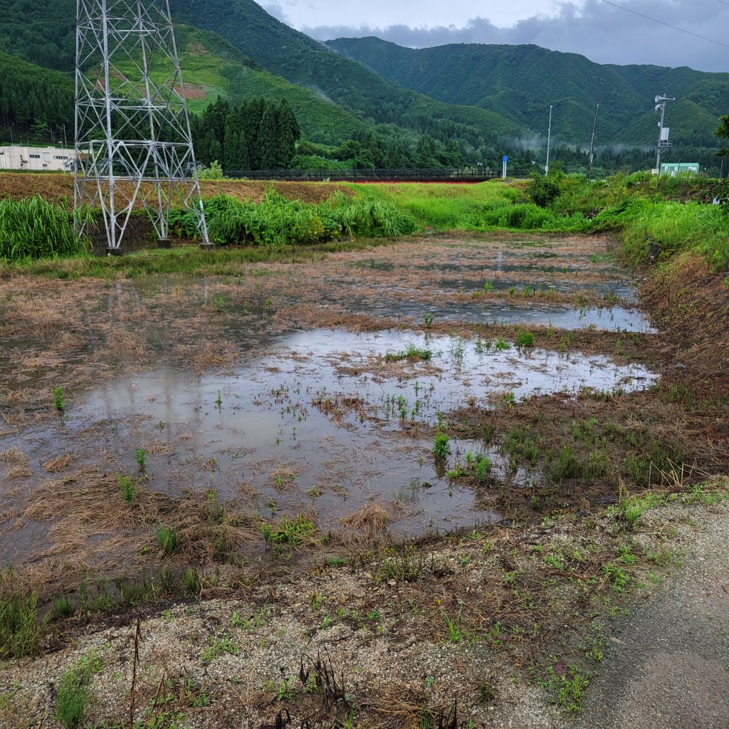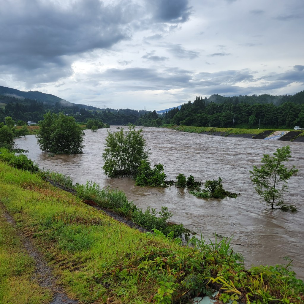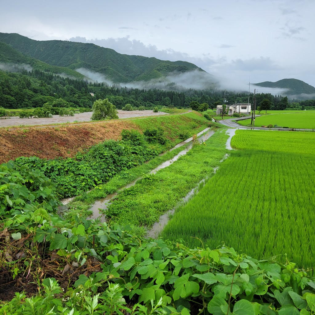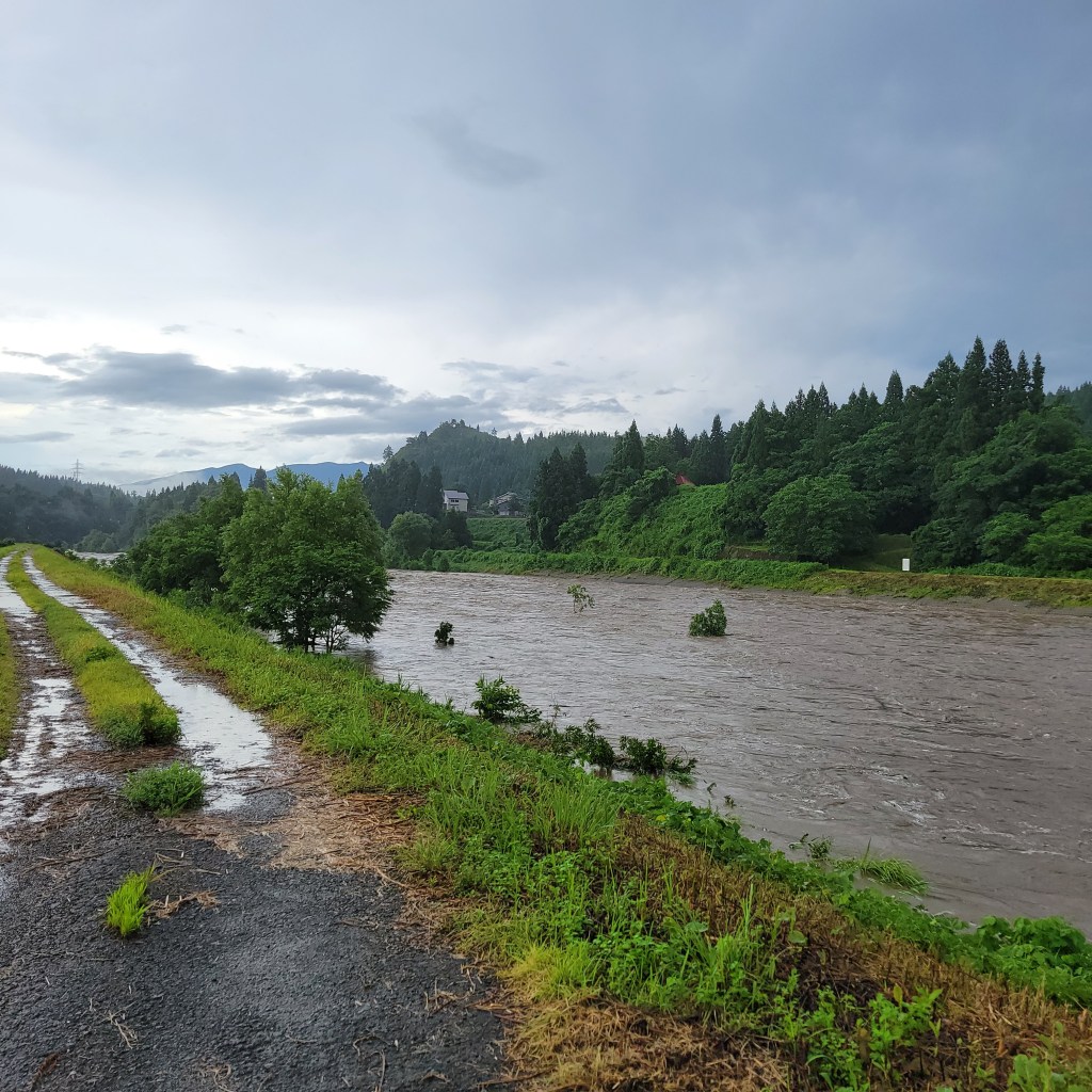 雨です。川が増水しています。早く早く、水を下流に流して。畑に溢れてきませんように