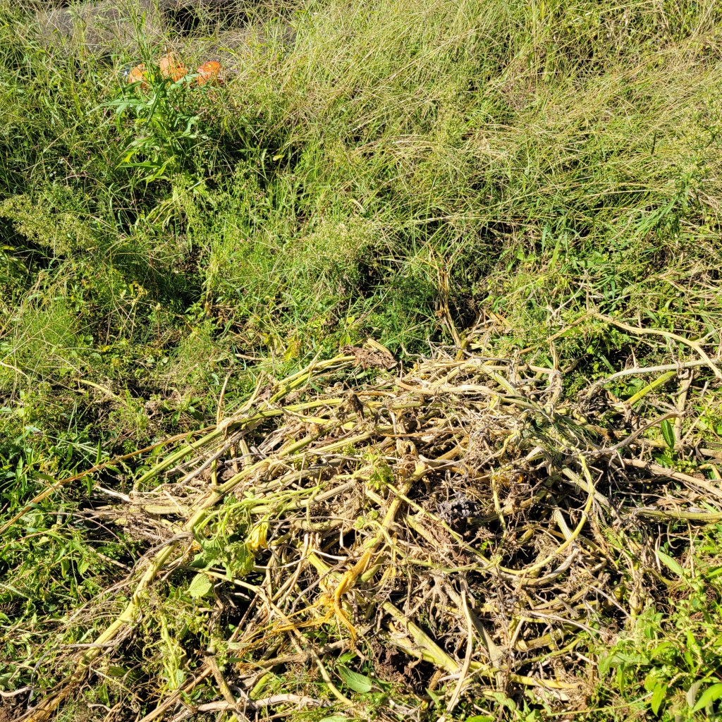 蔓は畑のはしにまとめておきます。来春、雪解けとともに小さくなった蔓を畑にすきこみます。