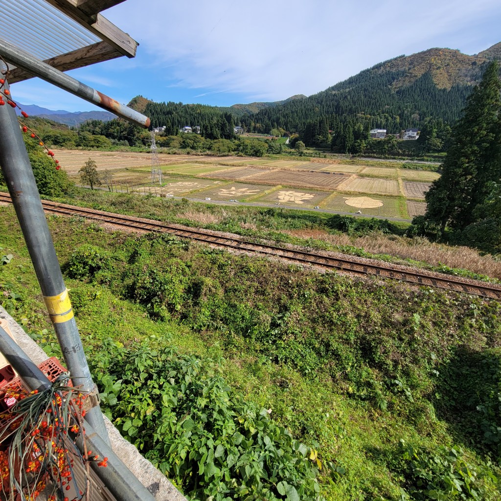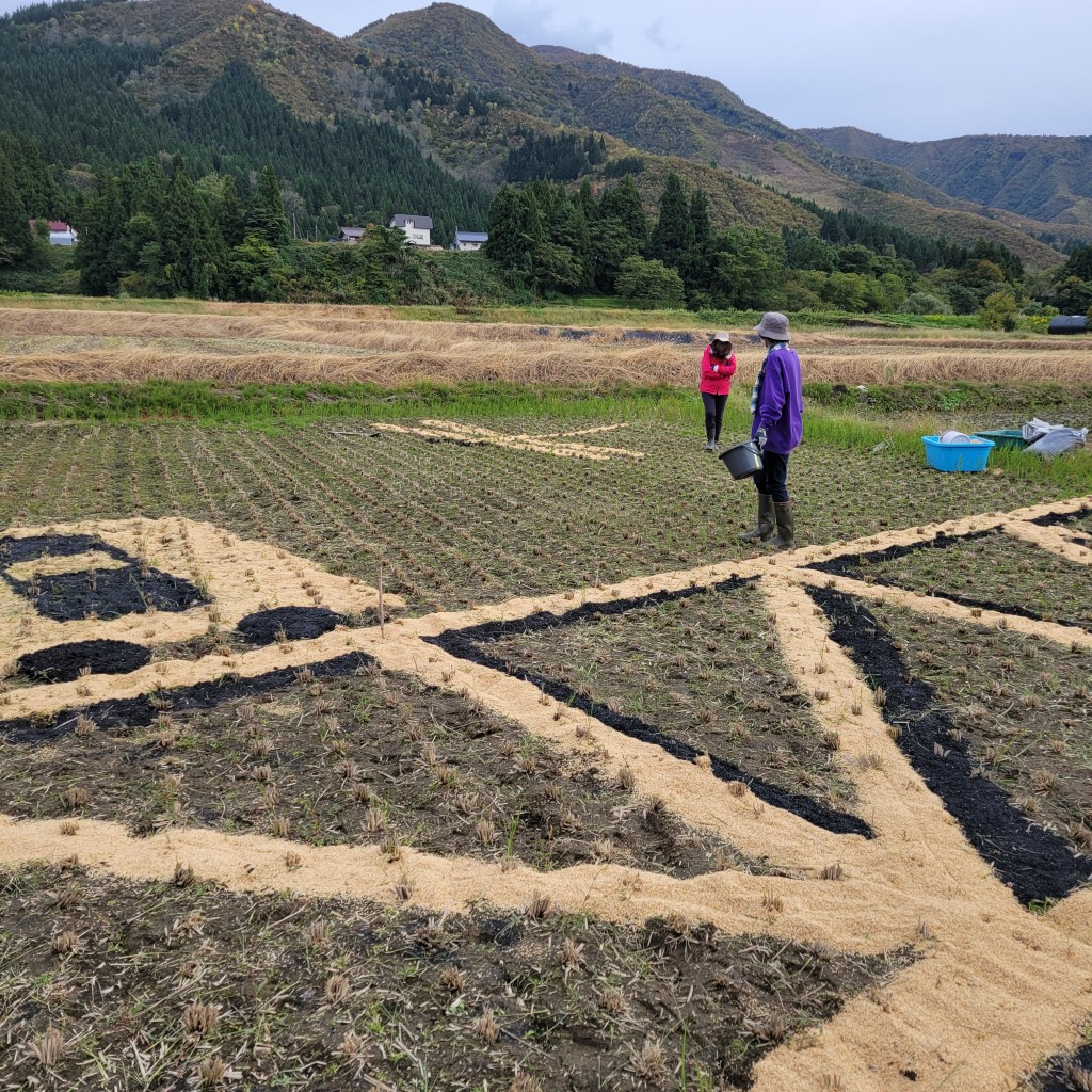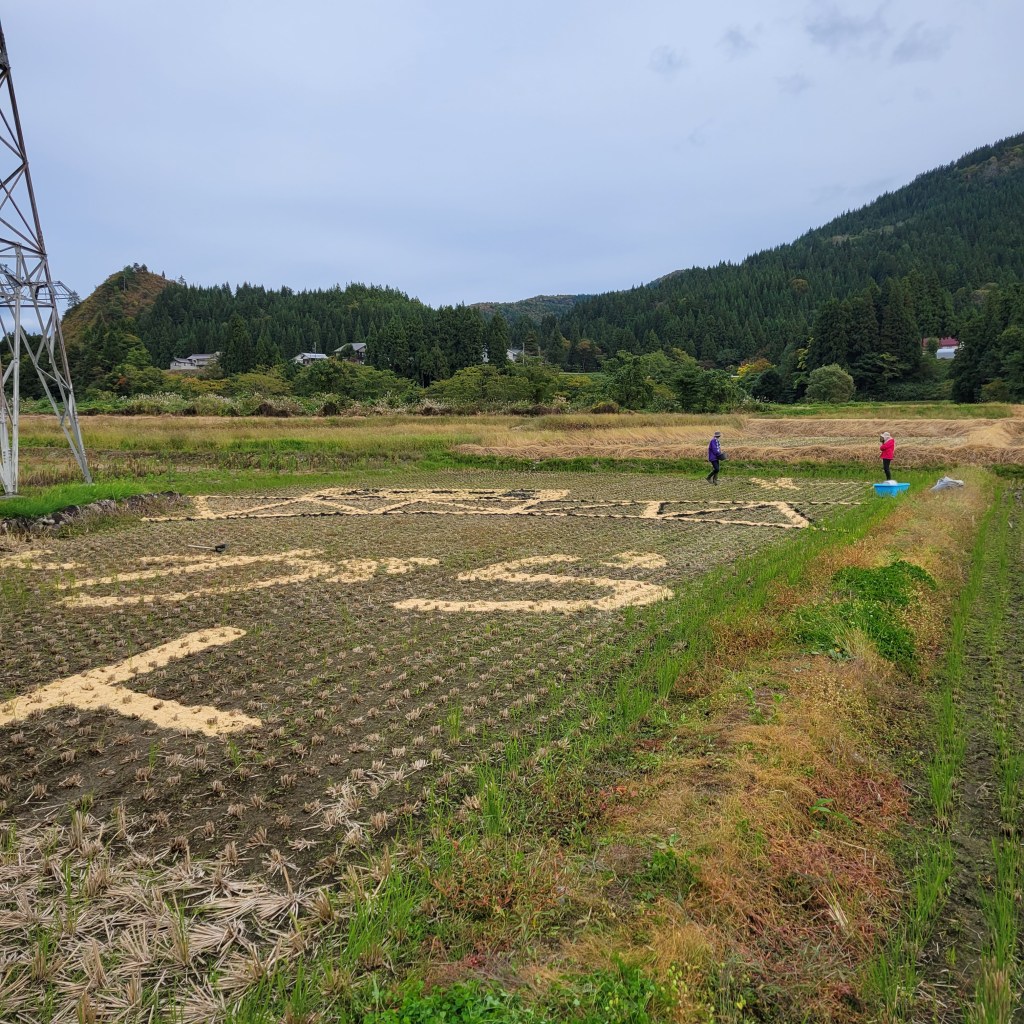 六年前に始まったもみがらアート、今年は四団体が制作しています。もみがらは白、それを焼き焦がした黒の二色で、田んぼに絵を描きます。