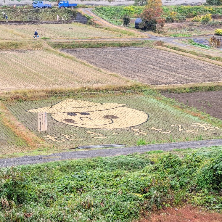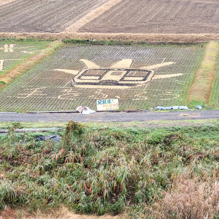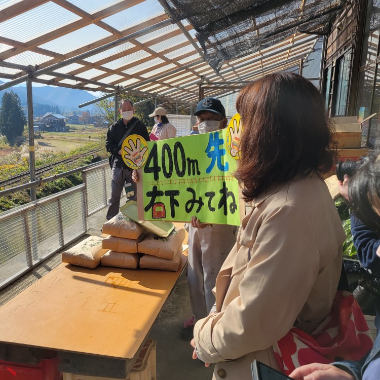 村長は、駅近くの踏切で「400m先の窓の外」を見て、と、只見線乗客に呼び掛ける看板をかかげています。もみがらアートを多くの人に気付いてもらうためです。