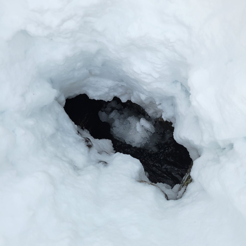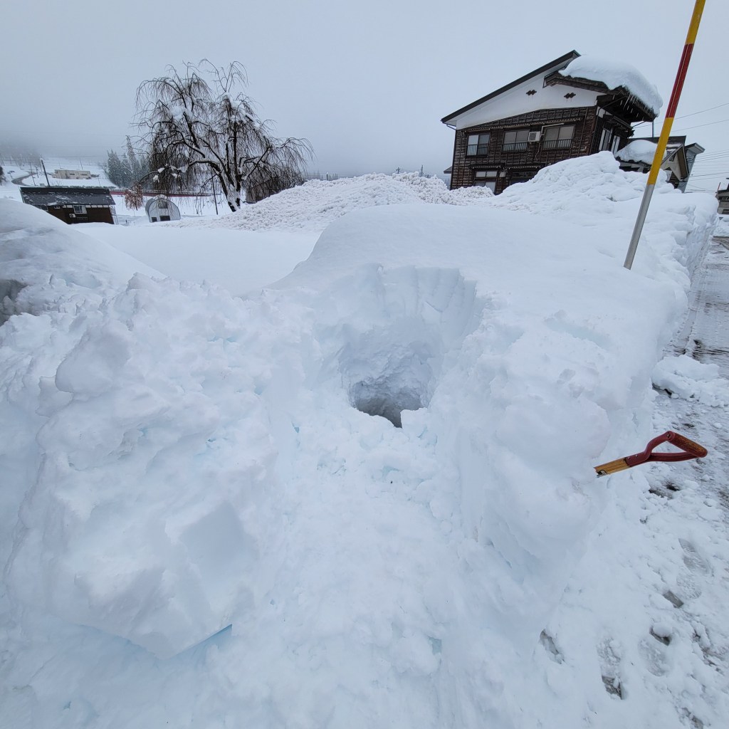 積もった雪を1mほど掘り進めると、水流が見えました。ここに向けて、少しずつ雪を落とします。