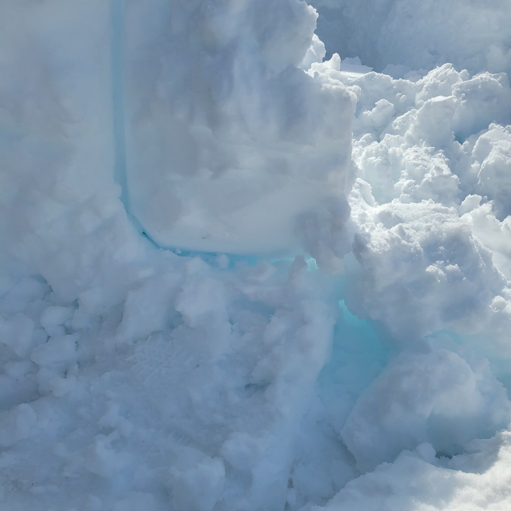 ひと休みに差したスコップの抜き跡は、青の洞窟のような青い色。雪に赤い長波系の光が吸収されて青く光るものと思われます。しばしその色に魅了されます。