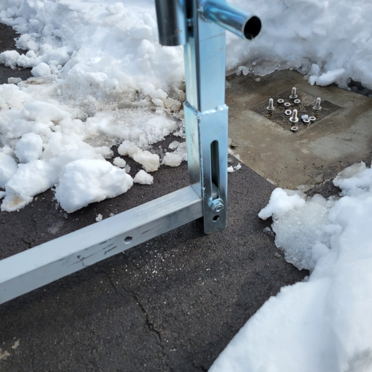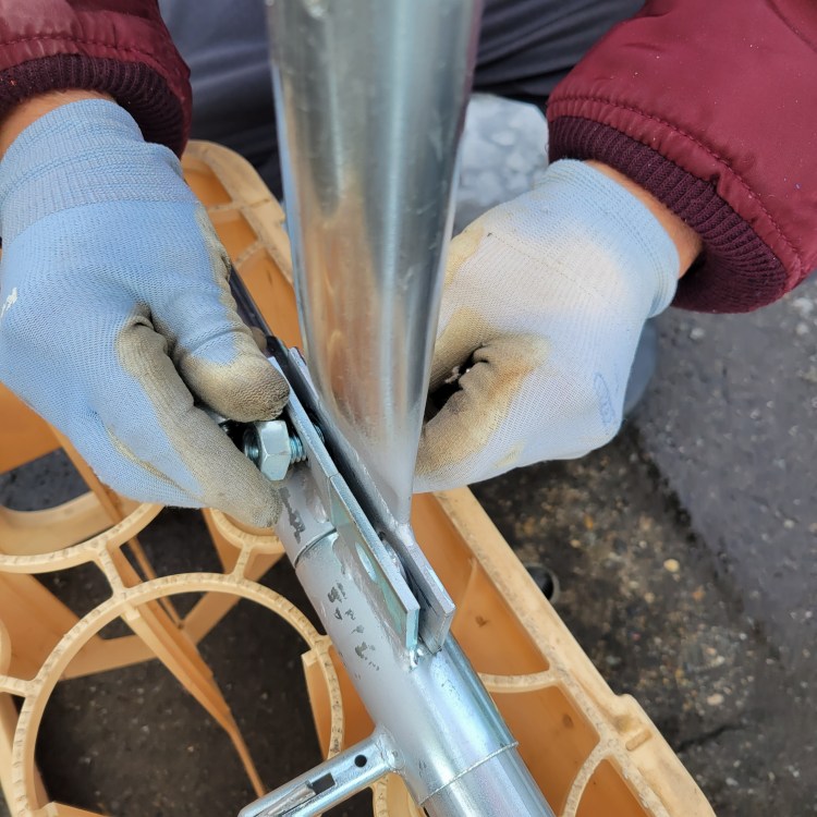 柱の足を折った状態。折れている部分のボルトは、スライドしながら上に持ち上がり、垂直になったところでもう一本のボルトで止めます。