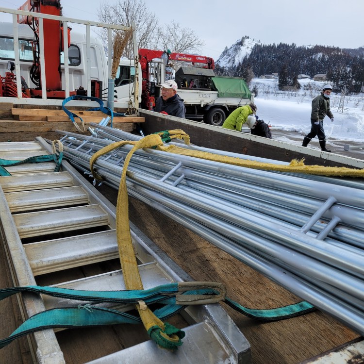 昨年秋に届いた資材は、近くの倉庫に保管してありました。その資材を搬入します。