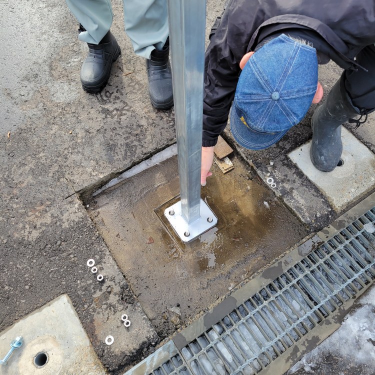 垂直に建てた柱は、地面に設置した基礎部分にボルトどめします。