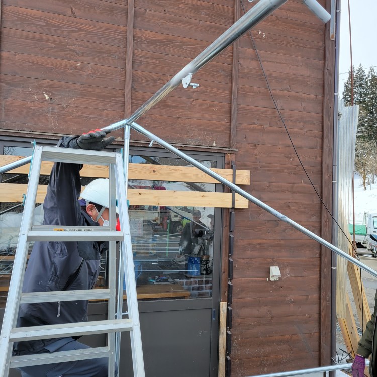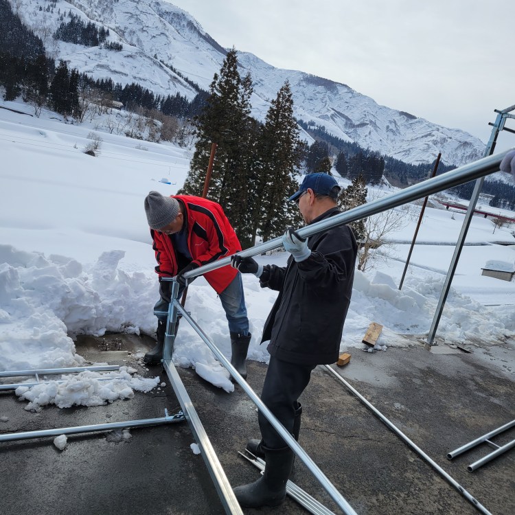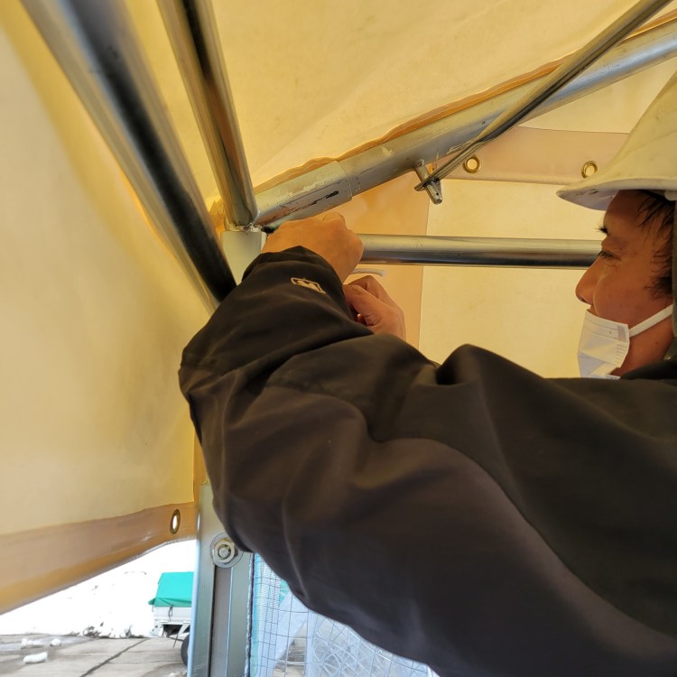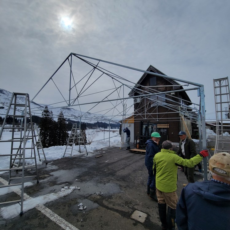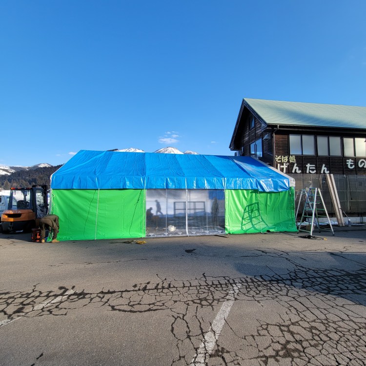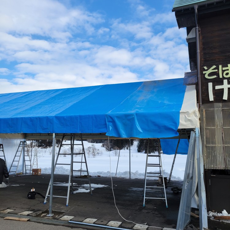 屋根にはブルーシートをかけます。3月はまだ雪が降るため、テントシートに雪が積もらないようにするための配慮です。