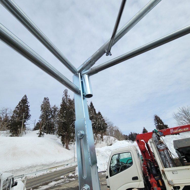 屋根の三角の中央部。左右から来た横梁を頂上部分から垂直に降りてきた縦の梁とボルトで結合します。