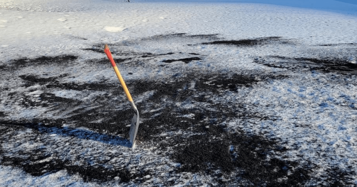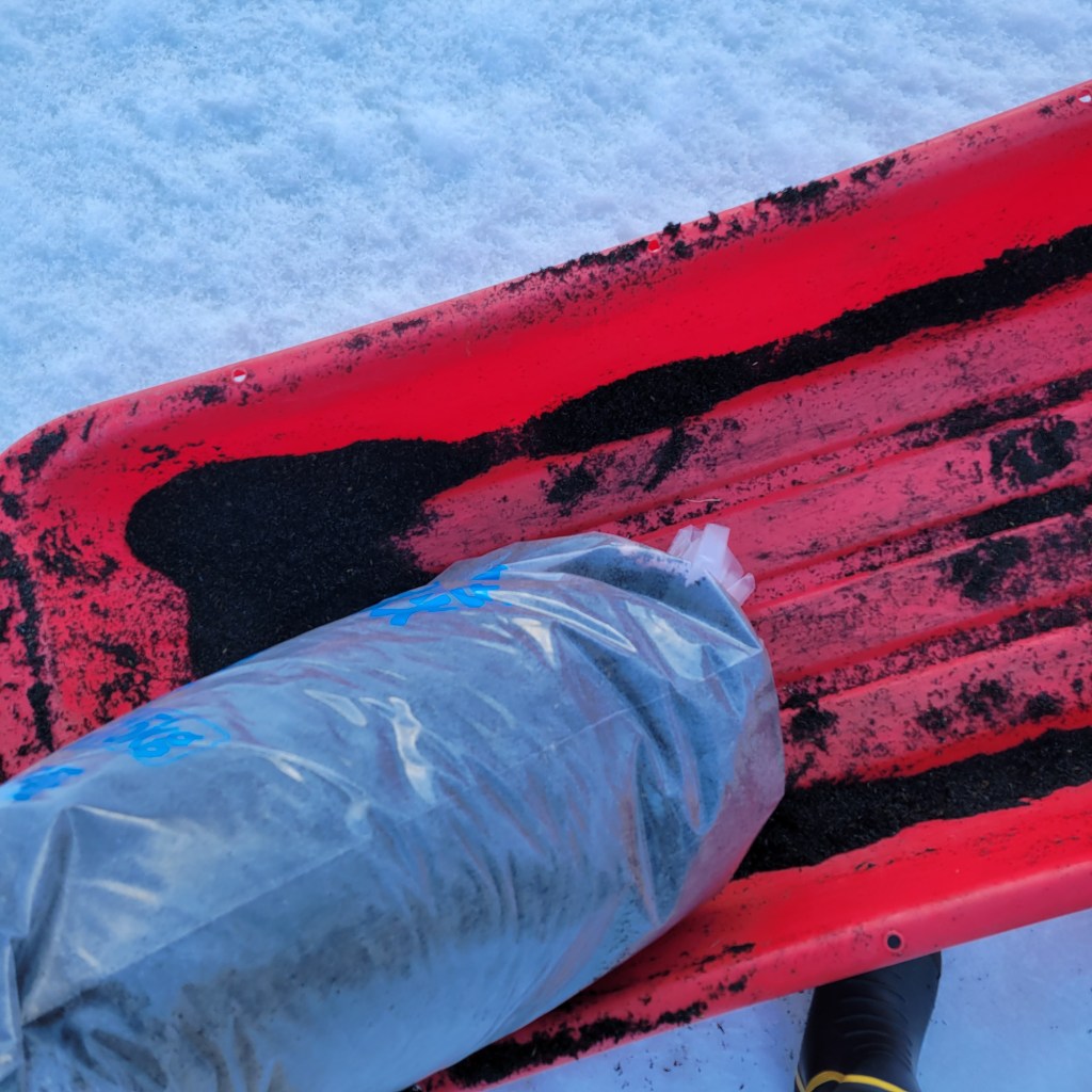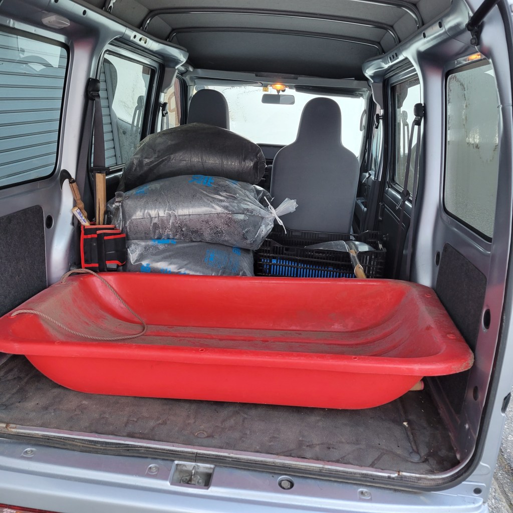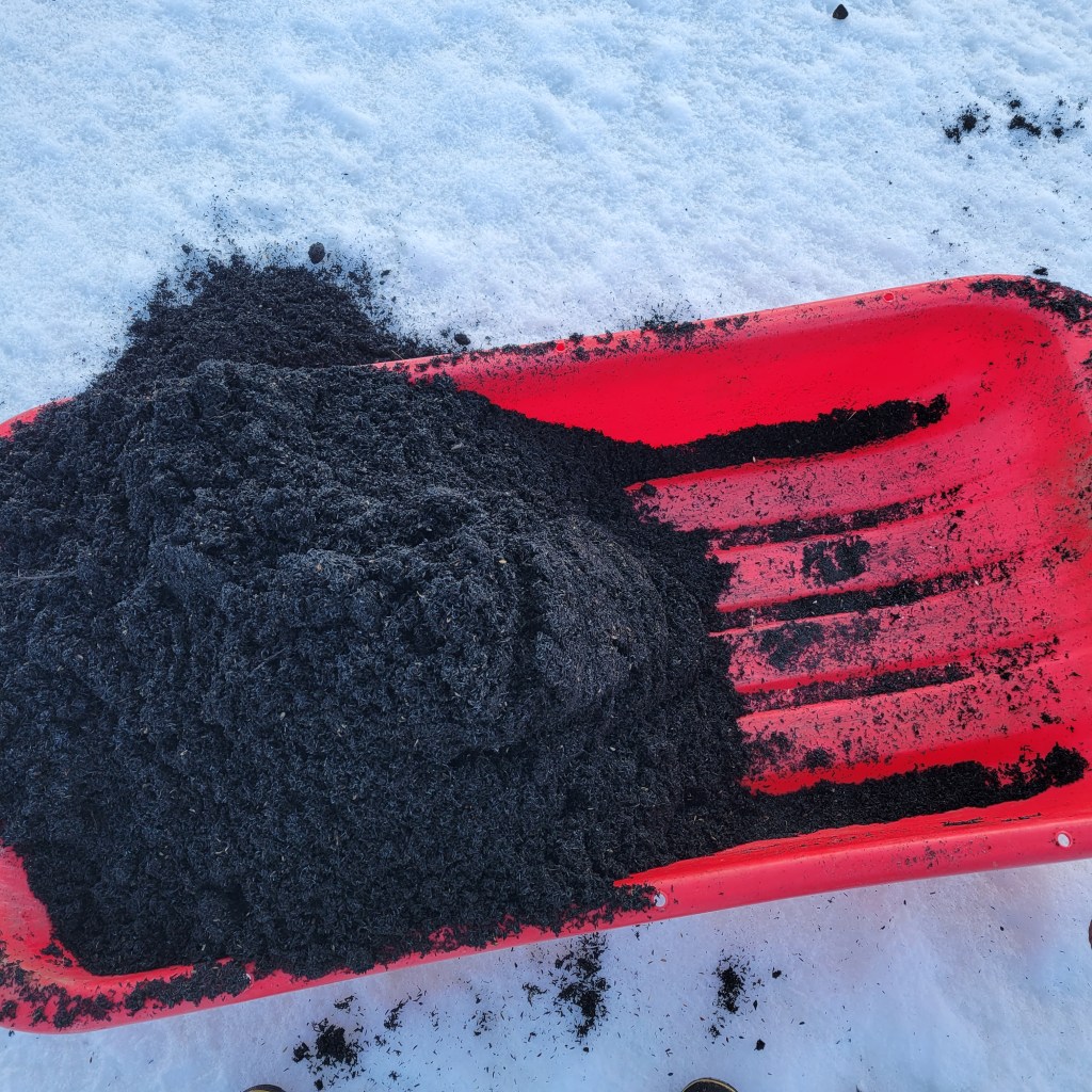 秋の間に焦がしたもみ殻をソリの上にあけます。