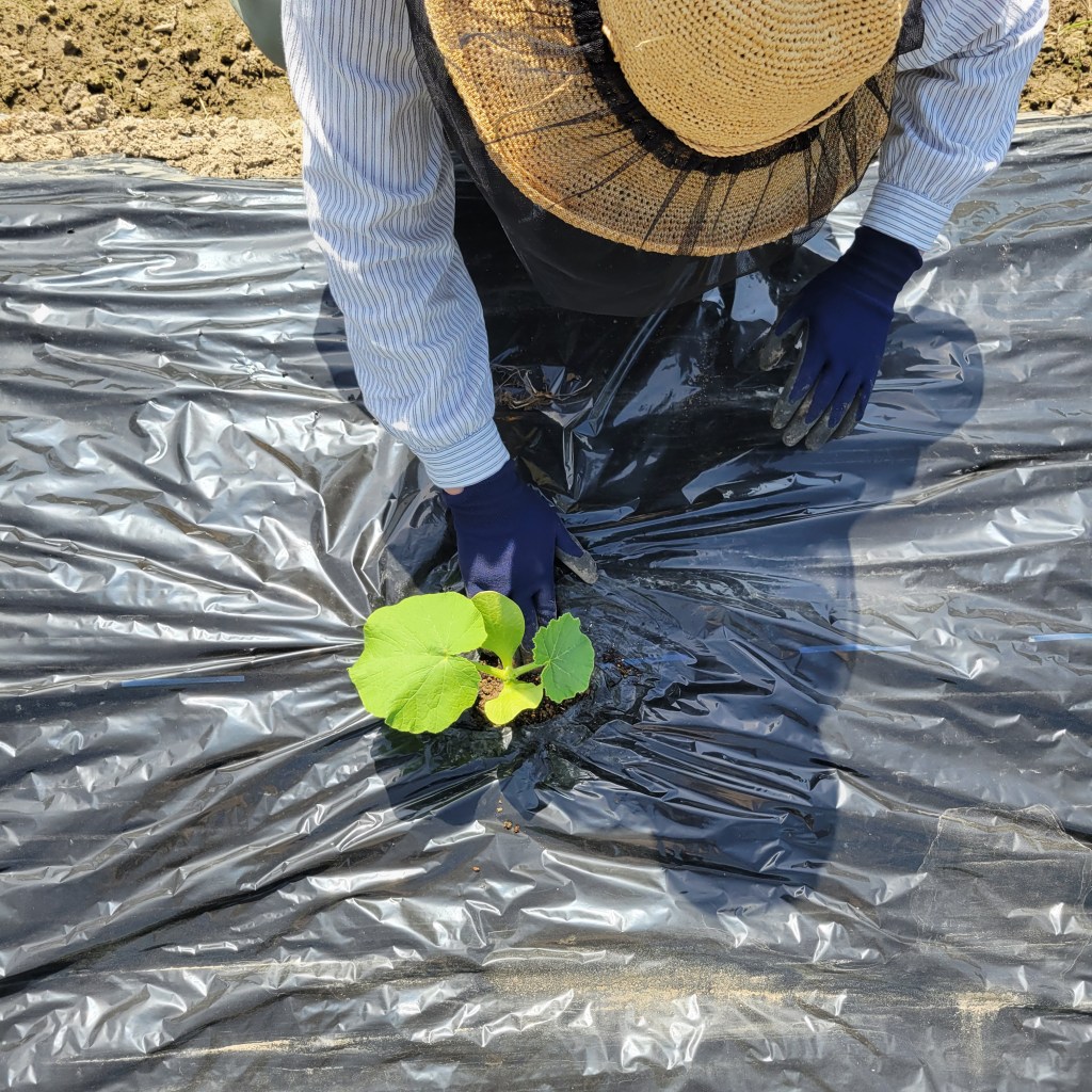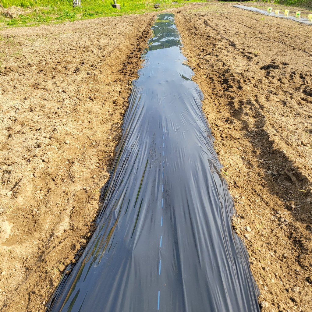 二週間前にマルチを張った畝に育てた苗を植えていきます
