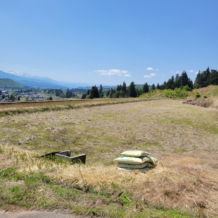 今年2024年の圃場となった田んぼです。手前に積んである薄黄色の袋は見附市から仕入れた鶏糞。有機肥料として一反(10アール)に10袋を撒く予定。右手遠方に見えるかたまりは、アゼが崩れて田んぼに張り出した土砂。これが理由で去年から休耕田になっているところをお借りしました。