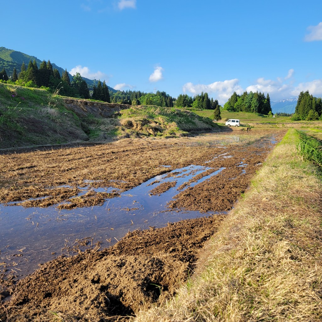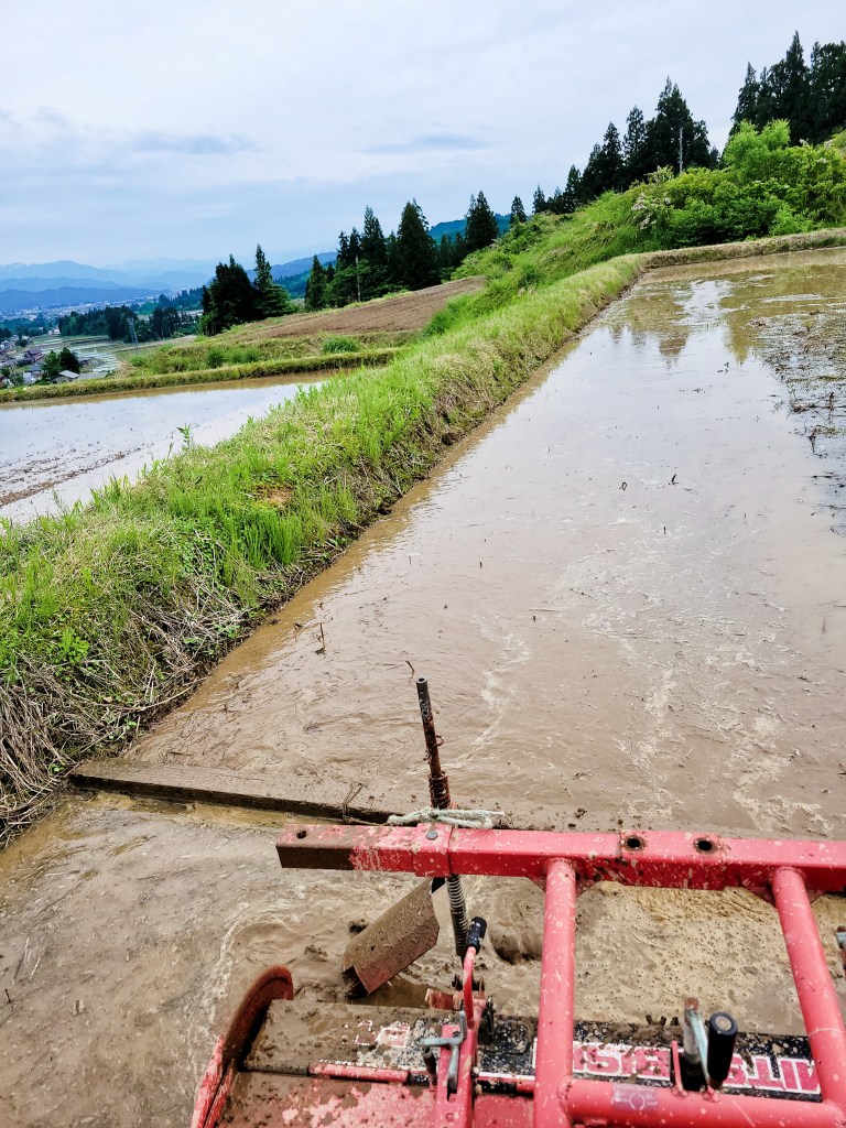 5月19日 いよいよ田植えを始めます。苗はJAで育ててくれたコシヒカリBLを使いました。現在魚沼産コシヒカリの主流はこのタイプ