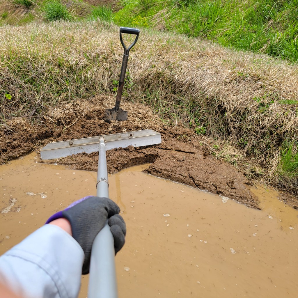 5月15日 代掻きは二度したいのですが、その前に田んぼの隅に溜まった土を手作業で掻き出します。畑の畝立てでも活用するエップリが大活躍。
