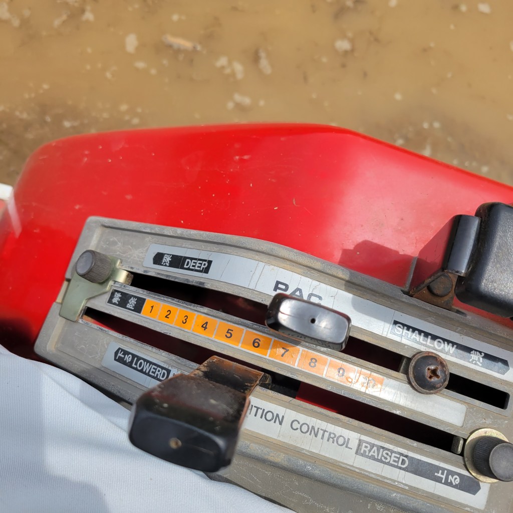 その時のトラクターのセッティング。手前がロータリーの高さを調整、奥がロータリーの刃の深さを調整