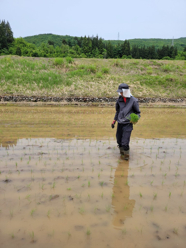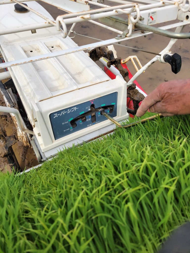 あらかた植え終わりました。初めてのことで、田植え機が空振りしながら植えずに進んだ場所がかなりあります。植え漏れを手作業で補っていきます。