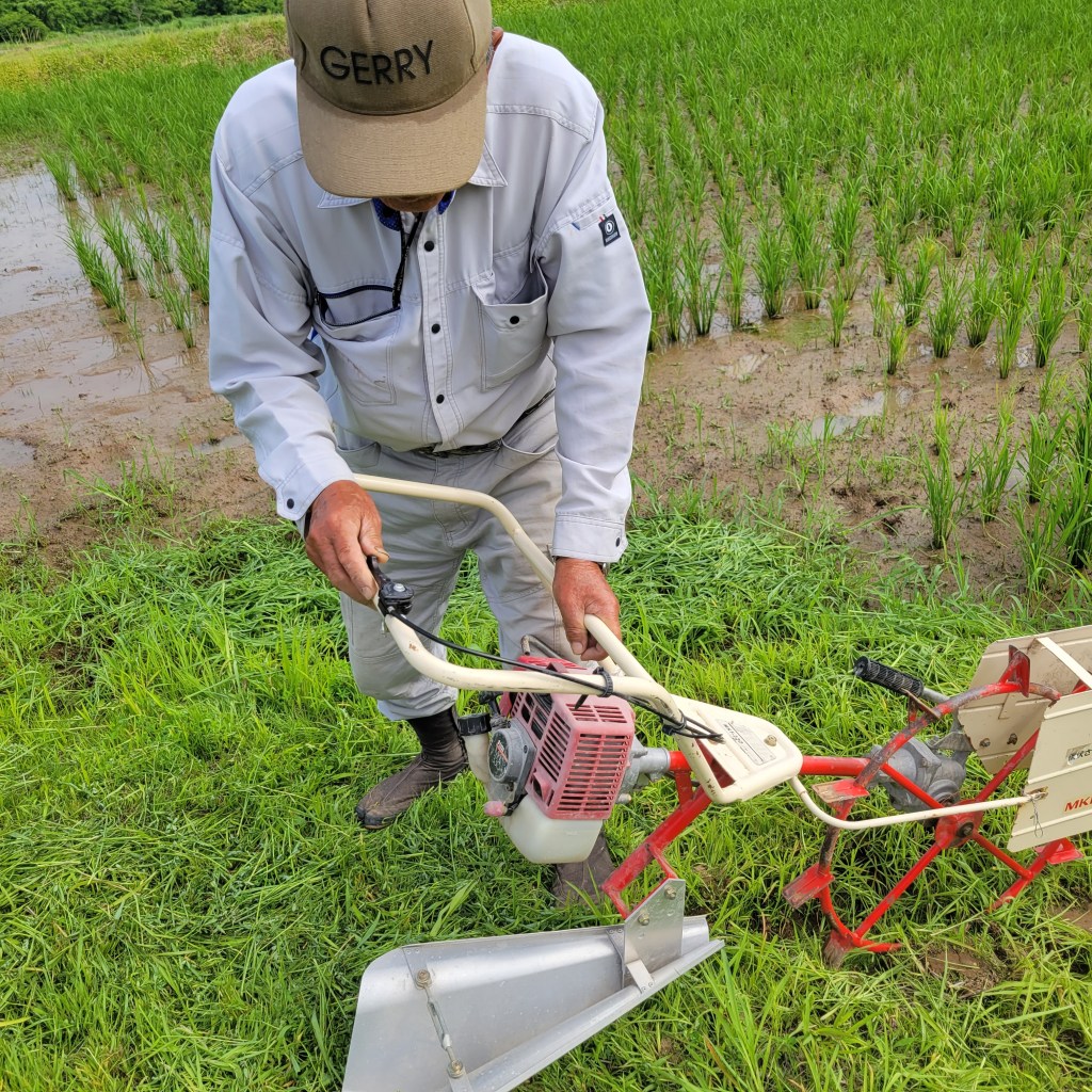6月22日 初めて溝切り機を使います。田んぼの排水を促すために、体重を使って溝を切ります