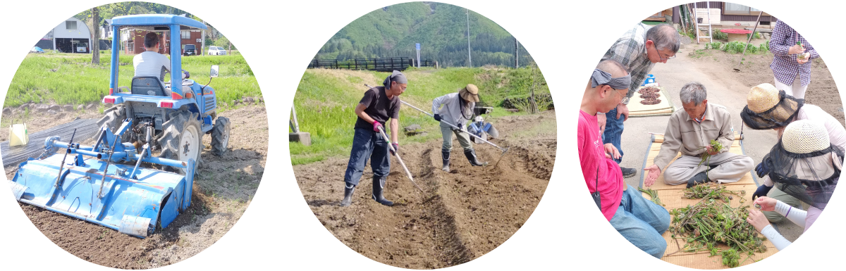 | 9月 | 稲刈り・ハザかけ・稲あげ・脱穀・ワラ製袋・籾摺り・製袋 |